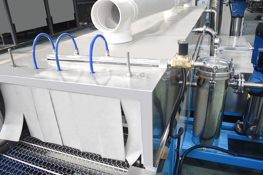 該設(shè)備有上下料網(wǎng)帶、超聲波清洗工位、噴淋漂洗工位、高壓風(fēng)切、熱風(fēng)烘干工位、溫控水加熱系統(tǒng)、風(fēng)機(jī)、溫控空氣加熱系統(tǒng)、移動式風(fēng)刀、PLC+觸摸屏控制系統(tǒng)、管路系統(tǒng)及智能電器控制系統(tǒng)等組成。自動進(jìn)排液和自動加溫系統(tǒng)完全實現(xiàn)了無人干預(yù),自動運行,很大程度上降低了工人的勞動強度。先進(jìn)的霧氣處理系統(tǒng)可以將清洗時產(chǎn)生的霧氣冷凝回流,空氣經(jīng)過濾和活性炭吸附后排出。