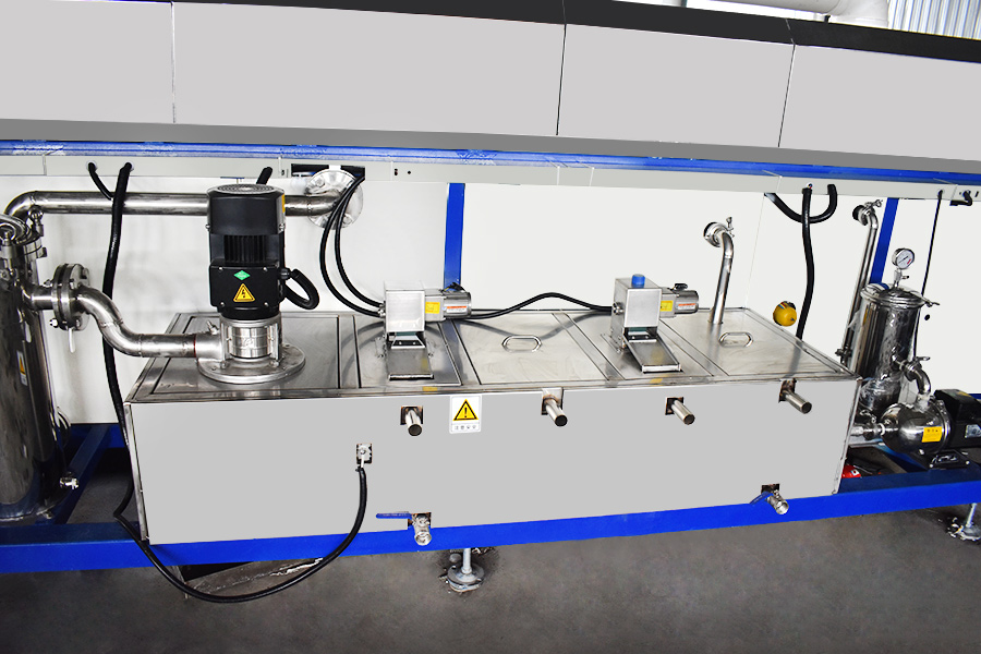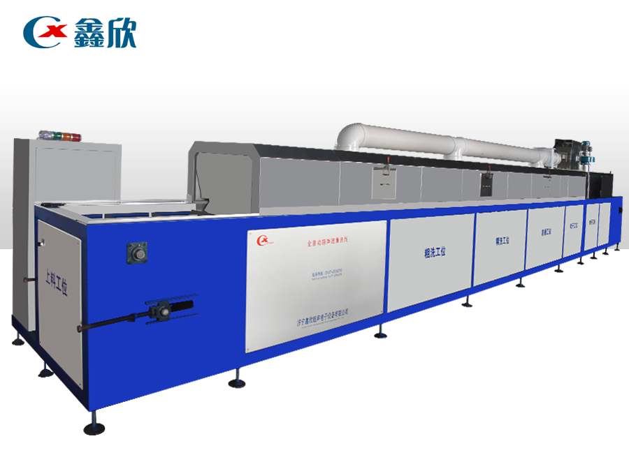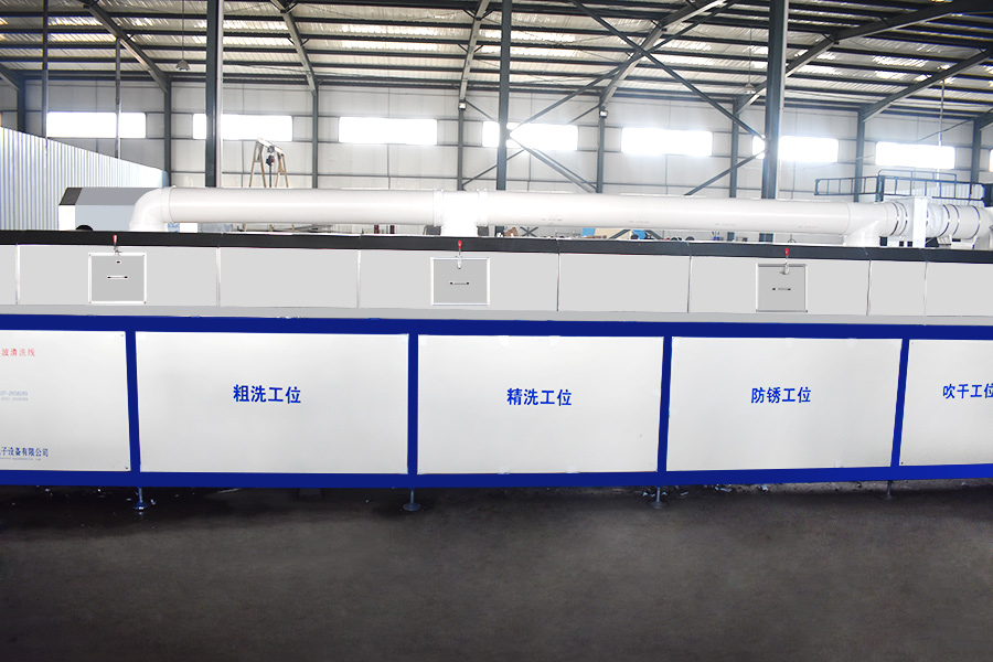 該設(shè)備有上下料網(wǎng)帶、超聲波清洗工位、噴淋漂洗工位、高壓風(fēng)切、熱風(fēng)烘干工位、溫控水加熱系統(tǒng)、風(fēng)機(jī)、溫控空氣加熱系統(tǒng)、移動(dòng)式風(fēng)刀、PLC+觸摸屏控制系統(tǒng)、管路系統(tǒng)及智能電器控制系統(tǒng)等組成。自動(dòng)進(jìn)排液和自動(dòng)加溫系統(tǒng)完全實(shí)現(xiàn)了無(wú)人干預(yù),自動(dòng)運(yùn)行,很大程度上降低了工人的勞動(dòng)強(qiáng)度。先進(jìn)的霧氣處理系統(tǒng)可以將清洗時(shí)產(chǎn)生的霧氣冷凝回流,空氣經(jīng)過(guò)濾和活性炭吸附后排出。