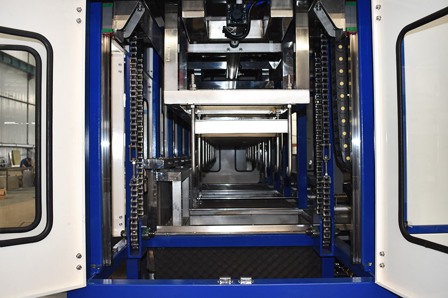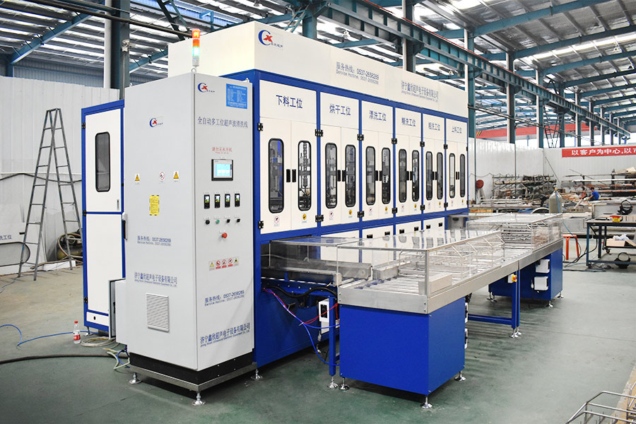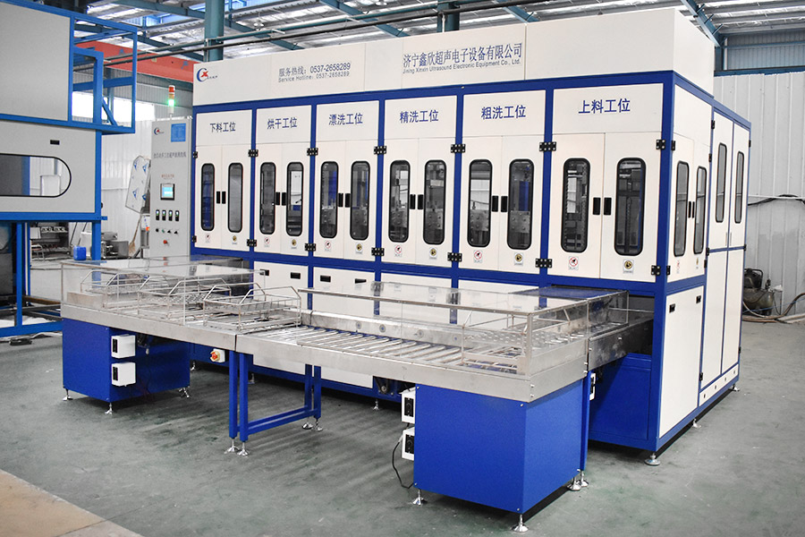 該設備有自動上下料及轉角系統、超聲波清洗系統,自動拋動、自動溢流和油污分離裝置,噴淋系統、自動高壓切水系統、自動烘干系統。機械手自動輸送系統采用高精度直線導軌配合高精度位置檢測傳感器,機械手可以準確的實現工件的抓取和放置。自動進排液和自動加溫系統完全實現了無人干預,自動運行,很大程度上降低了工人的勞動強度。先進的霧氣處理系統可以將清洗時產生的霧氣冷凝回流,空氣經過濾和活性炭吸附后排出。
